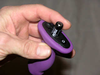 he G-play is a small purple silicone vibrator shaped like your typical G or P-spot toy. It requires one AAA size battery that I found to last about one hour before the vibrations diminish substantially. Inserting the toy with some water-based lubricant (be sure to only use water-based lubricant with this toy; no silicone- or oil-based lubes with silicone toys!) was nothing to write about due to the small size. Once in, the flush power button was very easy to turn on as I began to wax prolific.